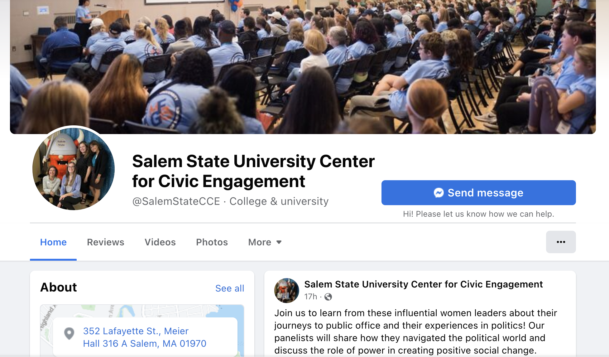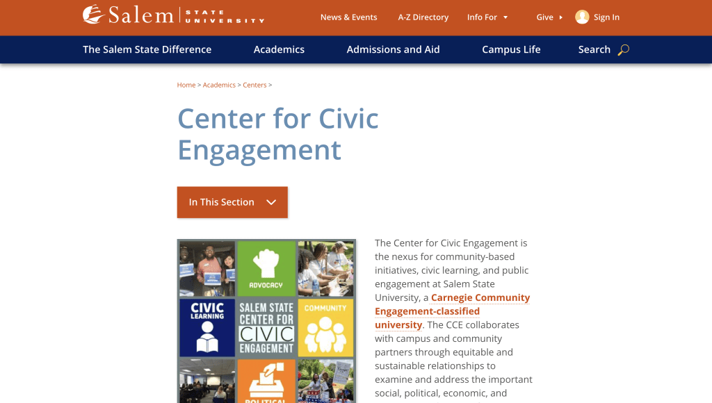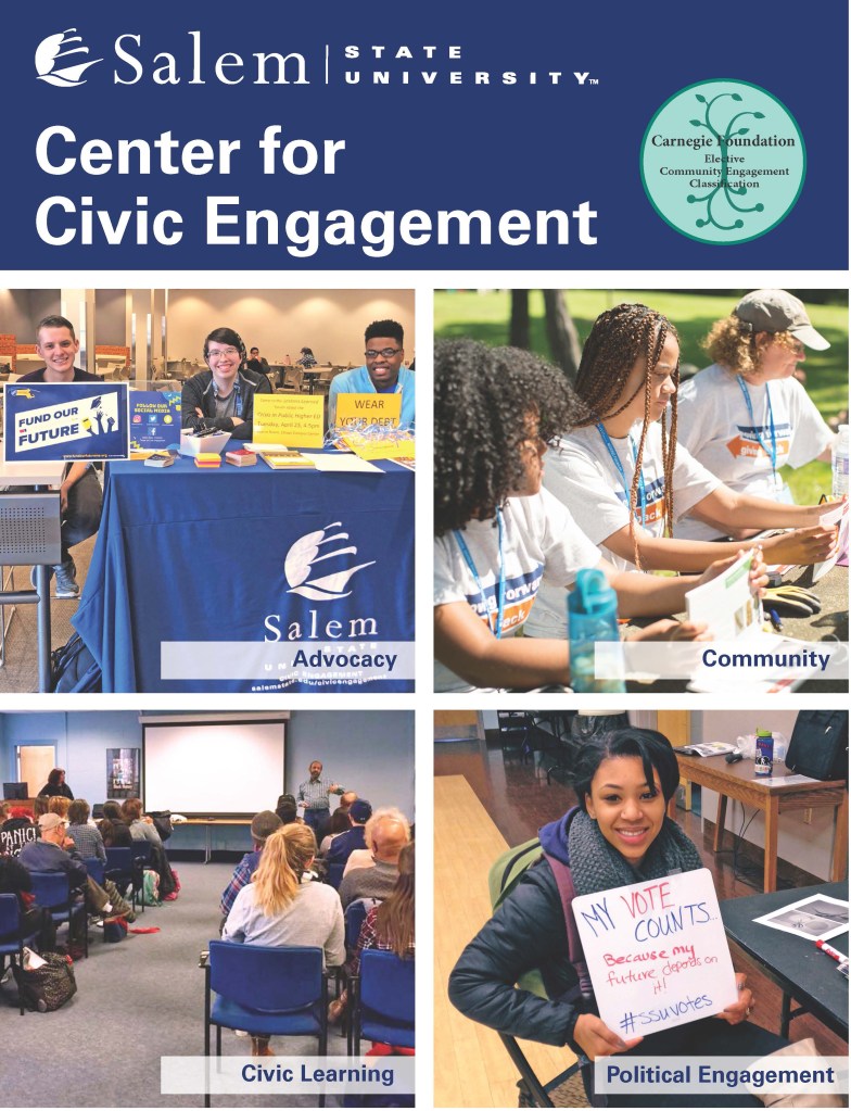 From 2015 – 2019, I served as the inaugural faculty fellow for the Salem State University Center for Civic Engagement. In this position, I was responsible for helping to develop the center’s vision and mission, marketing and outreach, and core civic engagement programming. Click on the images below to see a few of the marketing materials I created while working for the Center.